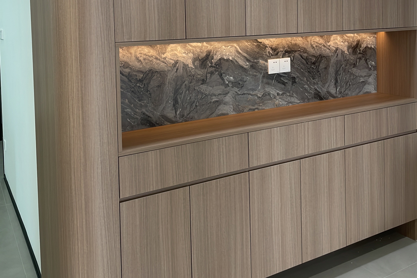 橱柜,是指厨房中存放厨具以及做饭操作的平台。使用明度较高的色彩搭配,由五大件组成,柜体,门板,五金件,台面,电器。